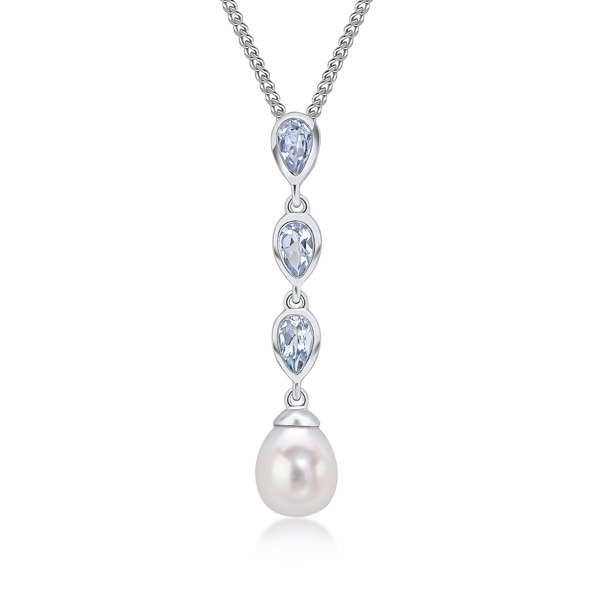 9CT White Gold Pearl & Pear Shaped Aquamarine Triple Drop Pendant