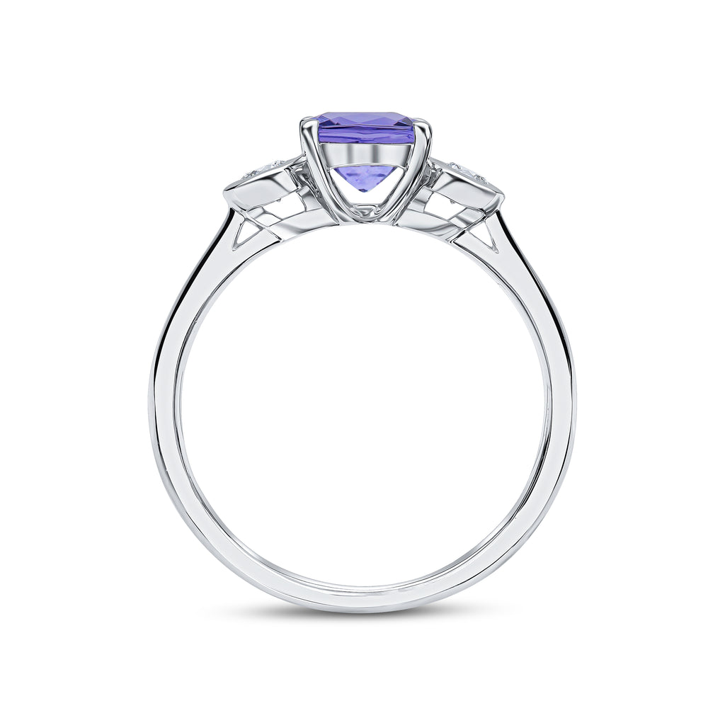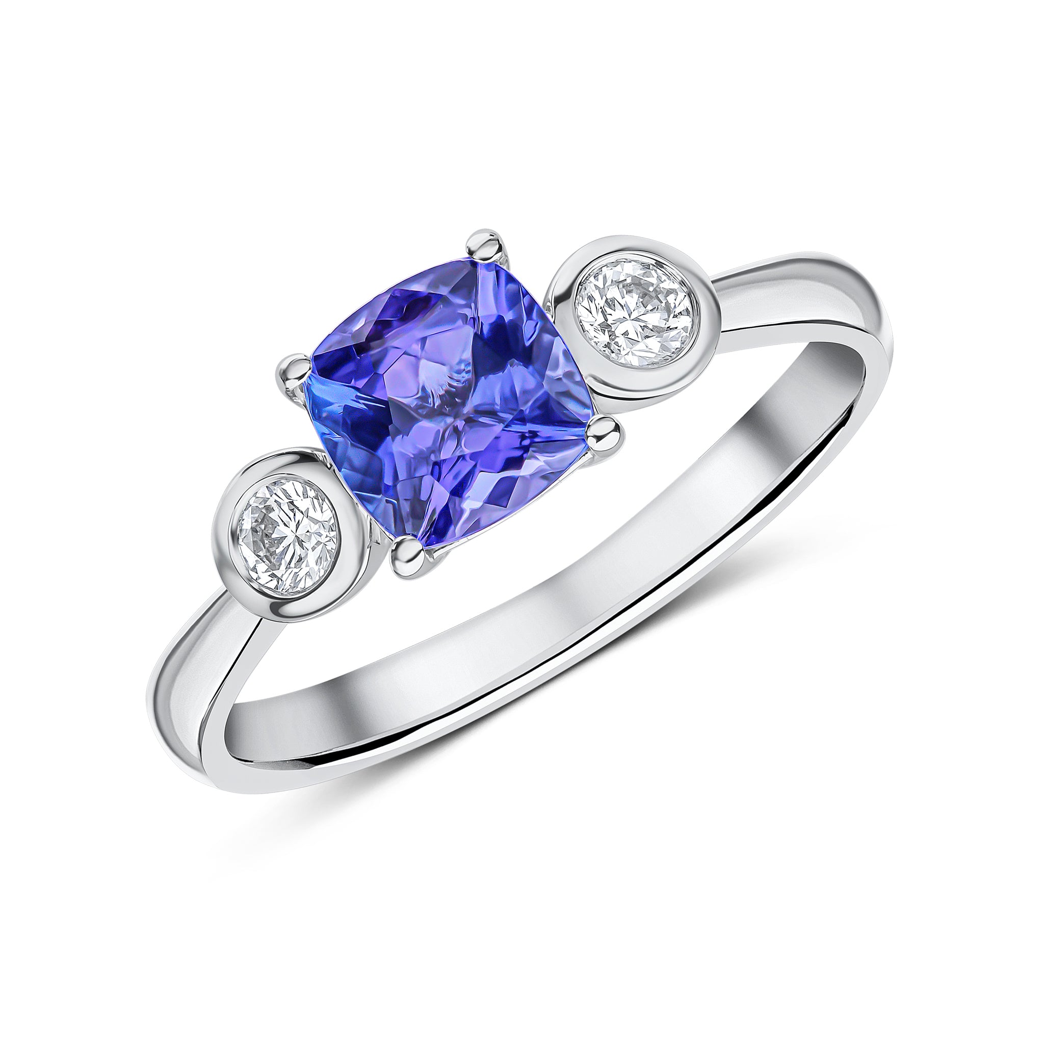 18CT White Gold Cushion Tanzanite Claw & Round Diamond Rubover Three Stone Ring 6mm