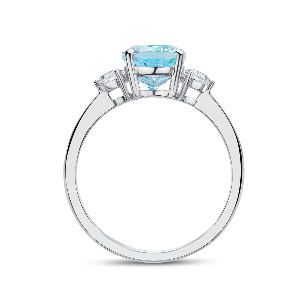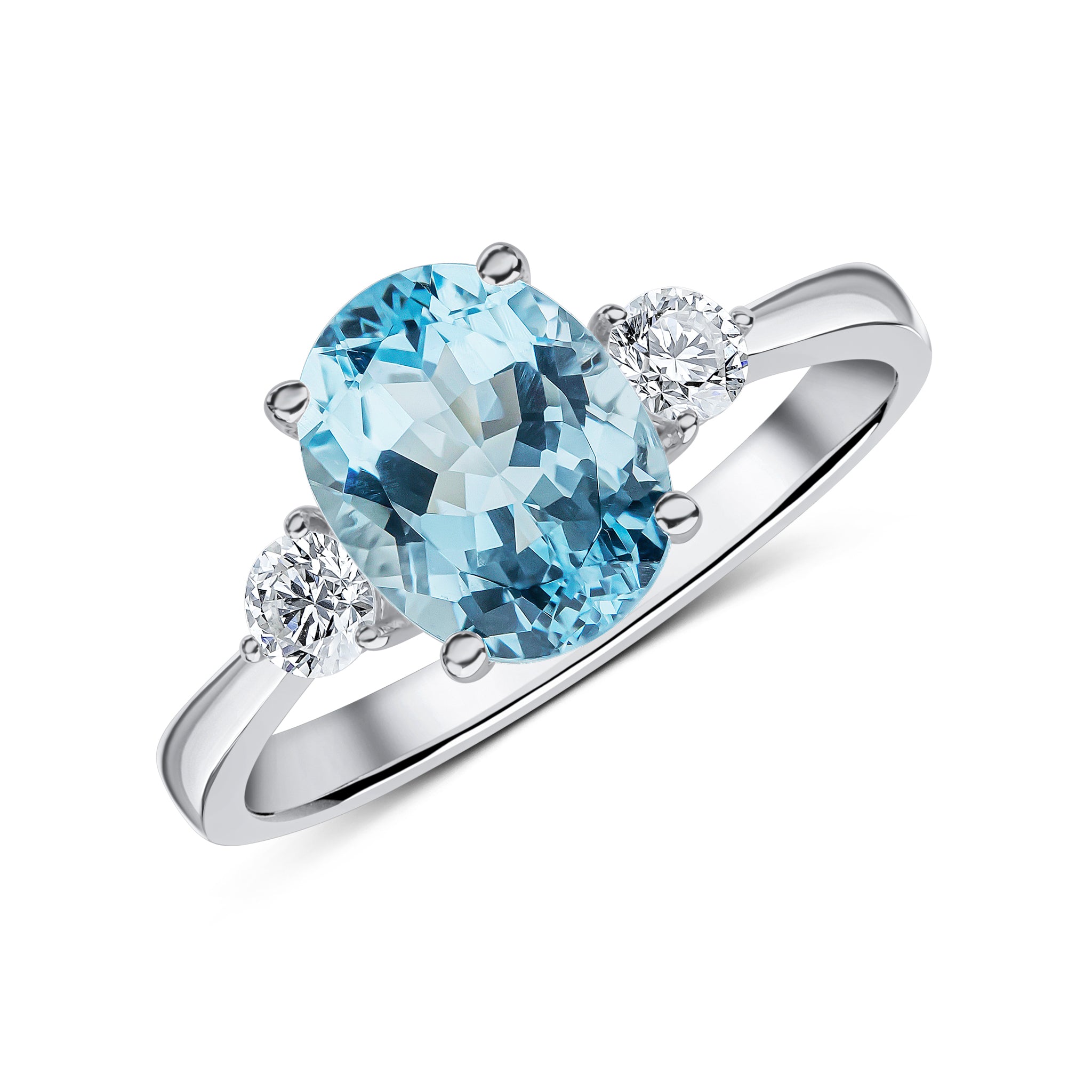 18CT White Gold Oval Aquamarine & Round Diamond Claw Set Three Stone Ring 9x7mm
