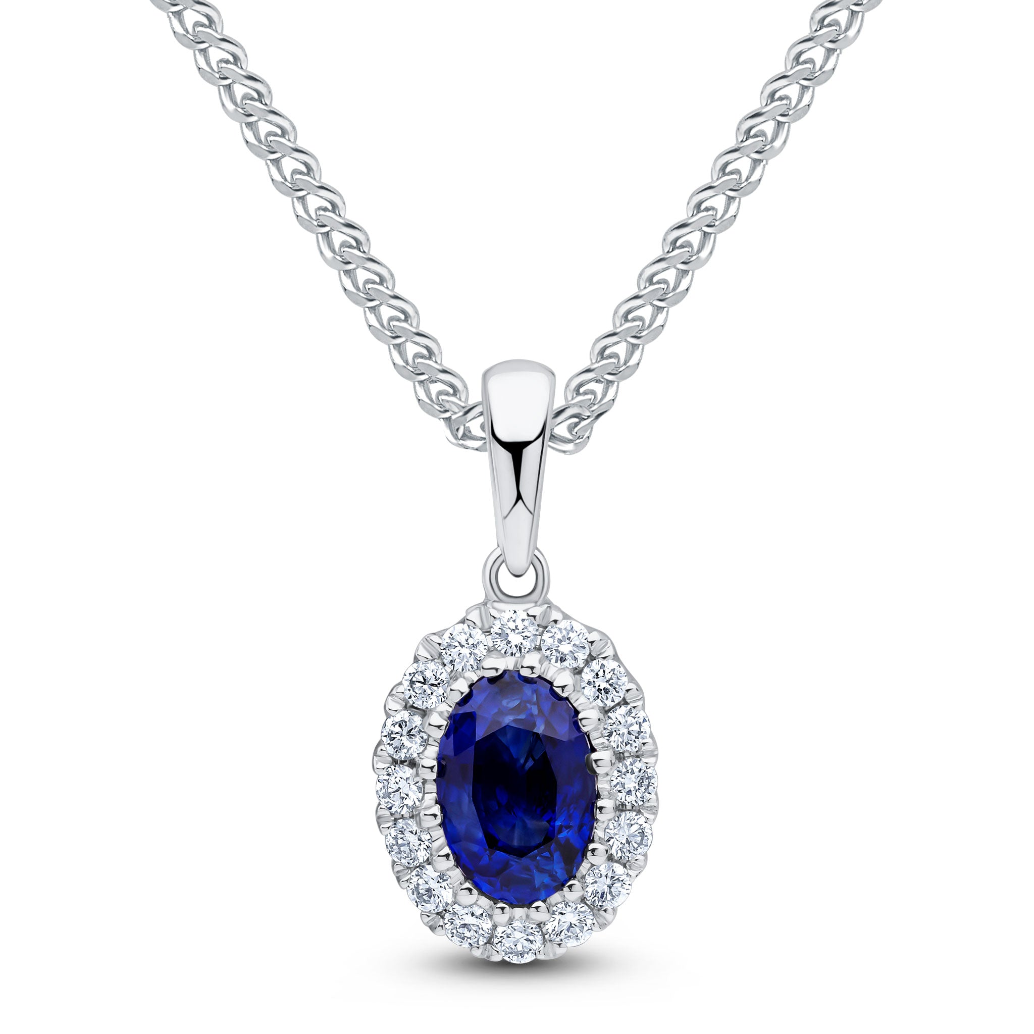 18CT White Gold Oval Sapphire & Diamond Cluster Pendant 6x4mm